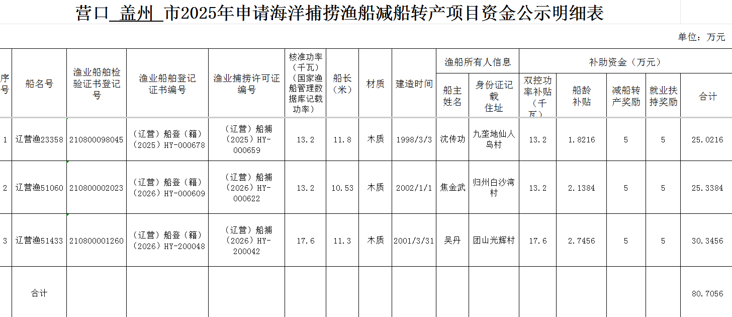 公示期滿后如無異議,我局將按程序?qū)ι鲜龃患跋嚓P(guān)證件移交至蓋州市珹惠發(fā)展集團有限公司,蓋州市珹惠發(fā)展集團有限公司兌付相應(yīng)的“減船轉(zhuǎn)產(chǎn)”補助資金。
