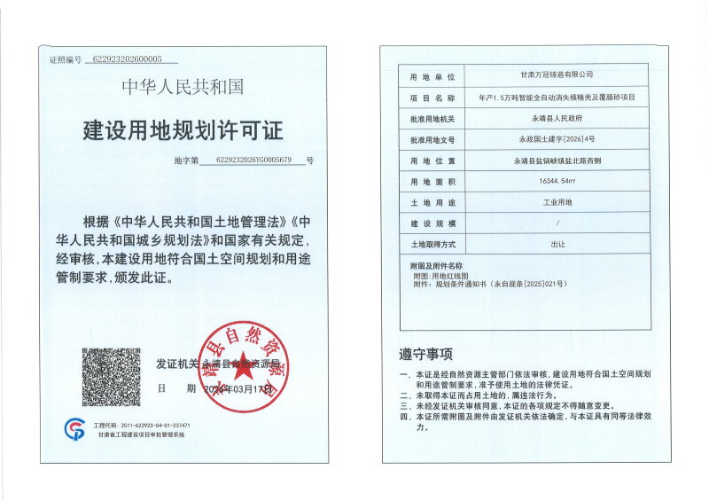 甘肅萬冠鑄造有限公司向我局申請辦理年產(chǎn)*.*萬噸智能全自動消失模精殼及覆膜砂項目建設(shè)用地規(guī)劃許可證,我局按程序?qū)ι陥蟛牧线M(jìn)行了審核并做出予以辦理的決定,現(xiàn)依據(jù)《行政許可法》《城鄉(xiāng)規(guī)劃法》《自然資源領(lǐng)域基層政務(wù)公開標(biāo)準(zhǔn)指引》等相關(guān)法律規(guī)定,對許可證證載內(nèi)容進(jìn)行公布: